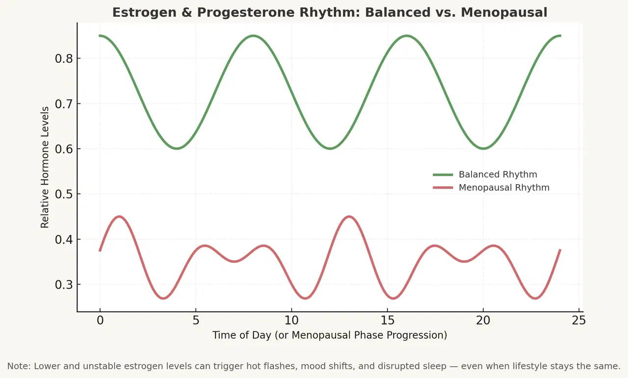The graph illustrates how a healthy hormone rhythm keeps estrogen and progesterone levels balanced throughout the day. During menopause, that curve flattens and becomes irregular, causing hot flashes, mood swings, and restless nights. This hormonal shift makes small triggers feel overwhelming — and rest harder to find.